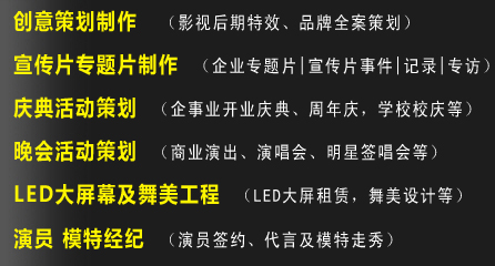 智慧力——創作團隊 創意總監——創意來自生活,高于生活 美術指導——身手敏捷,思想敏銳,具有獨特的美術嗅覺 資深策劃——思維縝密而又膽識過人,常常給人意外之喜 經典影視.品牌傳播,采用國際化的Team作業模式——